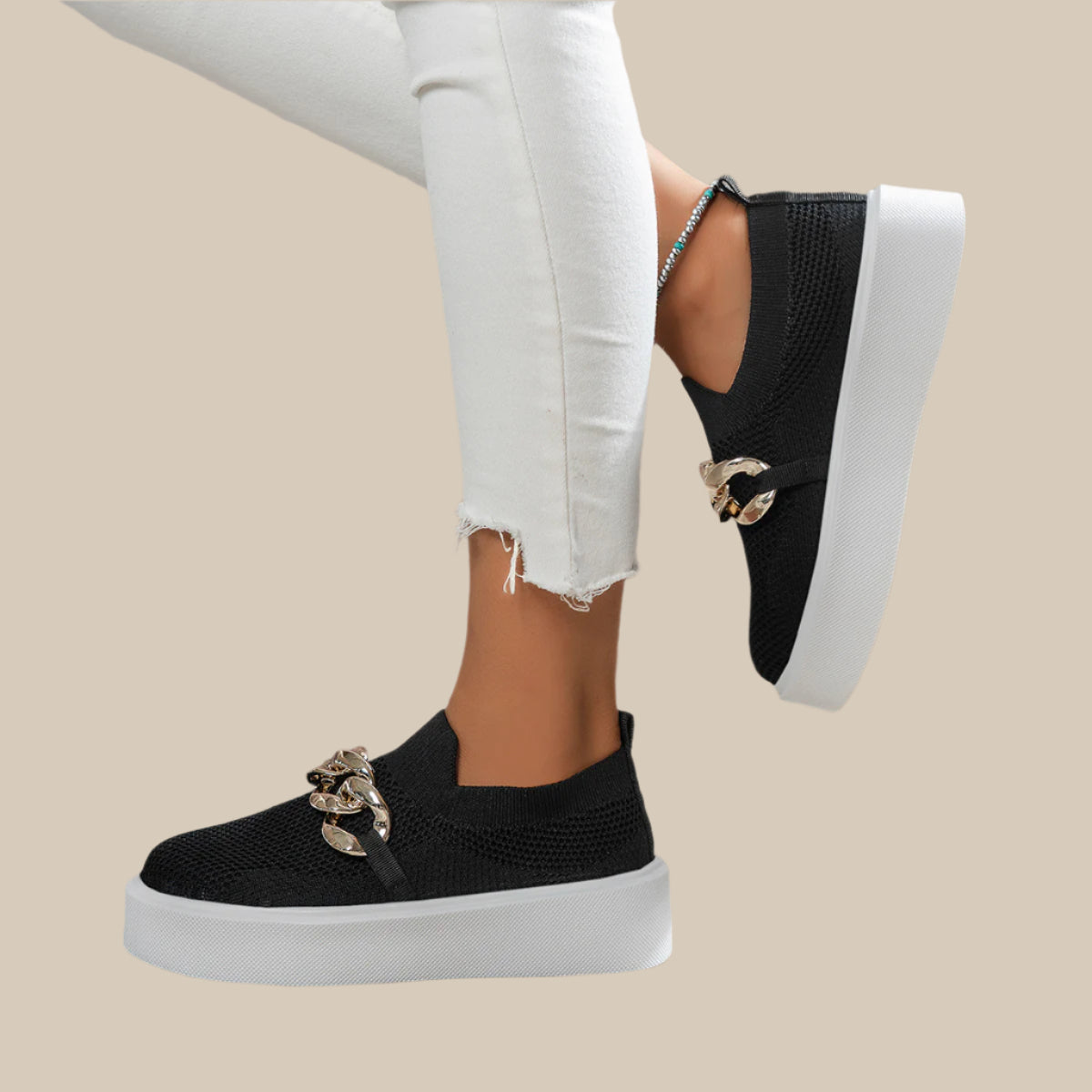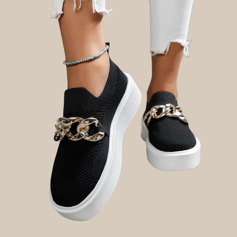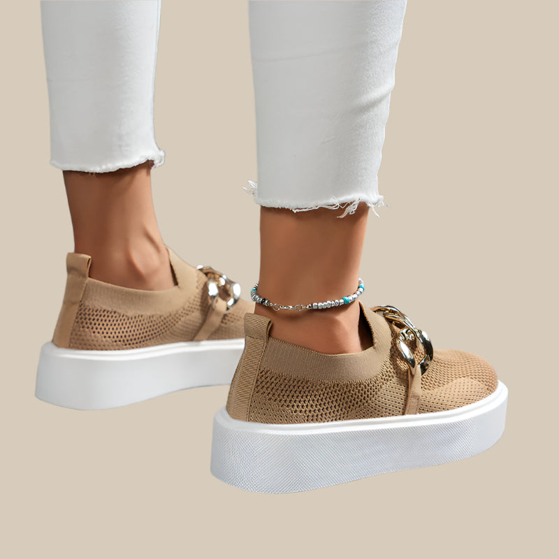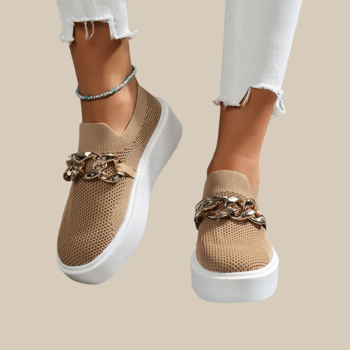 Deze Dames Instappers Met Kettingdetail combineren moderne flair met functioneel comfort. De ademende mesh-stof houdt je voeten fris, terwijl het subtiele kettingaccent zorgt voor een trendy look. Ideaal voor dagelijks gebruik, lichte wandelingen of casual dagen waarop je er toch verzorgd uit wilt zien.