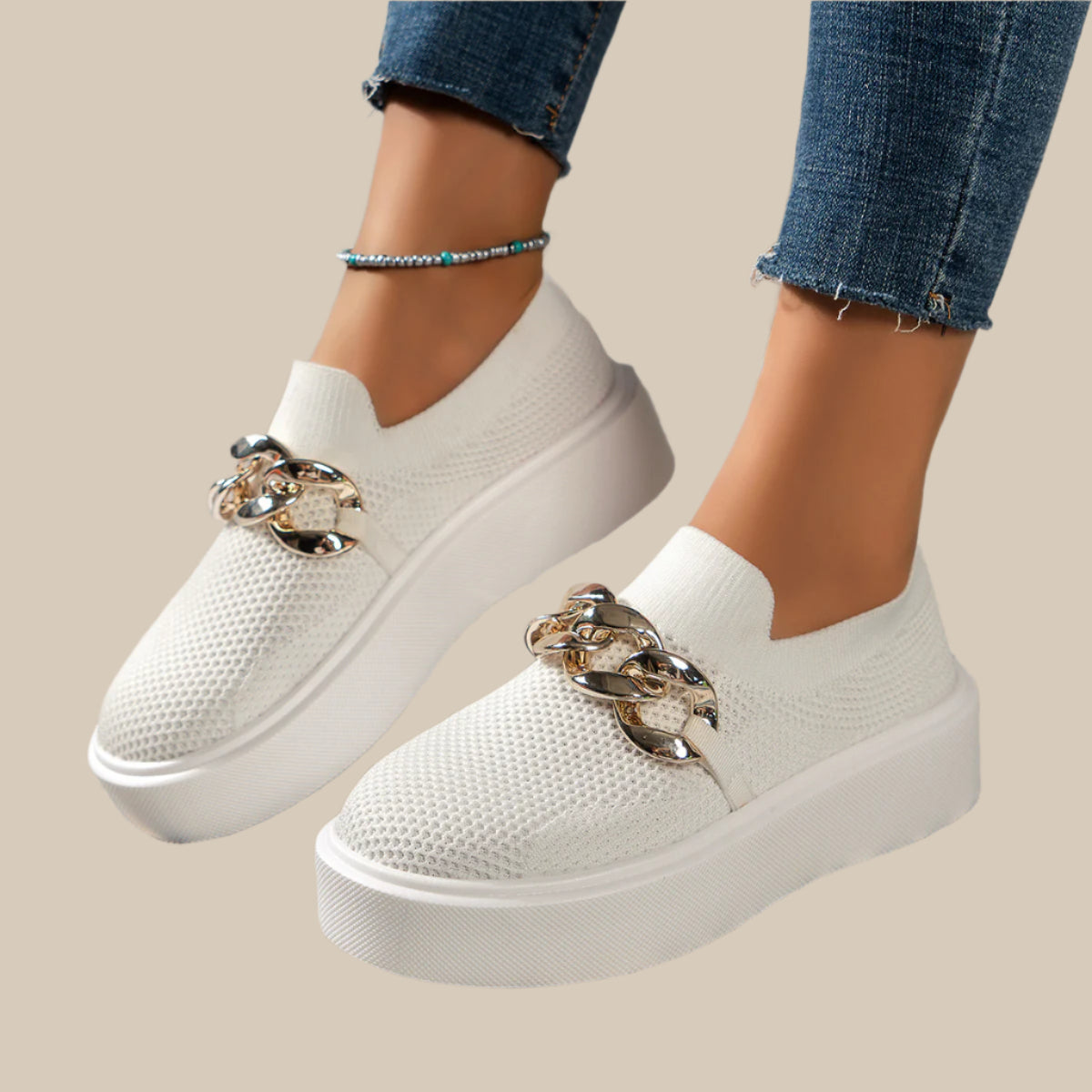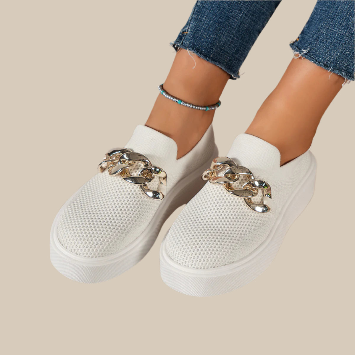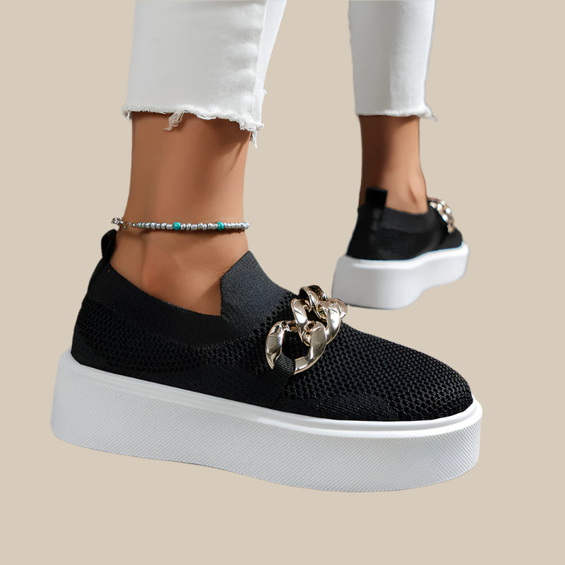 Deze Dames Instappers Met Kettingdetail combineren moderne flair met functioneel comfort. De ademende mesh-stof houdt je voeten fris, terwijl het subtiele kettingaccent zorgt voor een trendy look. Ideaal voor dagelijks gebruik, lichte wandelingen of casual dagen waarop je er toch verzorgd uit wilt zien.