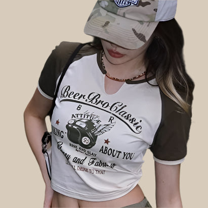 Deze top combineert moeiteloos sportieve flair met vrouwelijke elegantie – perfect te dragen met jeans, shorts of een high-waist rok.